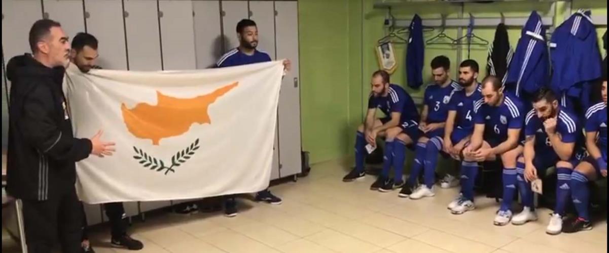 «Κύπρος… Η μάνα μας… Εγέννησε μας… Αναγιώννει μας… Ταΐζει μας, ποτίζει μας. Αγαπά μας, φροντίζει μας. Έχει ανάγκη την αγάπη μας. Κύπρος… Προδώθηκε, μαχαιρώθηκε και έβγαλαν τα αίματα της. Ταλαιπωρήσαν την και ακόμα ταλαιπωρούν την. Κύπρος… Εβιάσαν τις κόρες της… Σκοτώσαν τα κοπελλούθκια της… Τι ζητά; Δεν αντέχει άλλα μαράζια. Έσπασε. Έχει ανάγκη και απαίτηση από τα κοπελλούθκια της που έμειναν, εσείς δηλαδή, να τις δώσετε λίγο οξυγόνο και χαρά για να αναπνεύσει. Ελάτε στη θέση της. Έσπασε. Ρωτάτε την και σε δυο ώρες, δώστε της λίγη χαρά…», αναφέρει μεταξύ άλλων ο προπονητής της Εθνικής.